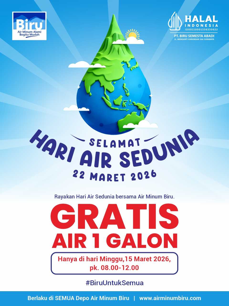 Dalam konteks tersebut, Air Minum Biru kembali menjalankan program tahunan Gratis Isi 1 Galon Air Minum Biru, yang telah konsisten dilakukan selama lima tahun terakhir dalam rangka Hari Air Sedunia. Setiap warga berhak mendapatkan 1 galon air minum secara gratis, tanpa syarat pembelian atau transaksi. Warga hanya perlu membawa botol galon kosong milik sendiri ke gerai Biru terdekat. Di tahun ini, program diadakan pada hari Minggu tanggal 15 Maret 2026, dilakukan secara serentak pukul 08.00-12.00 waktu setempat di 766 gerai yang tersebar di 46 kota dan 15 provinsi di Indonesia.