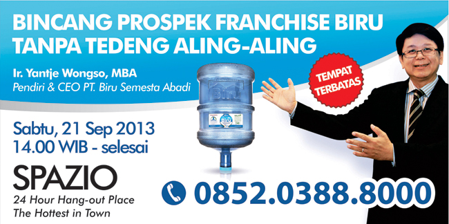Air Minum Biru akan menyelenggarakan Bincang Prospek Franchise Biru Tanpa Tedeng Aling-Aling yang menghadirkan pendiri dan CEO Air Minum Biru Ir. Yantje Wongso, MBA. Beliau adalah orang pertama dibalik lahir dan kebe...