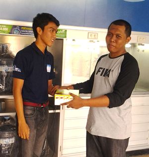 Kue yang dipesan anak-anak dari Toko Roti Mayestyk Jakarta yang dikumpulkan dari dana pribadi tim gerai dan Supervisornya cukup memberikan kesan tersendiri buat Saya pribadi dan akhirnya menyematkan potongan kue pertamanya untuk yang paling lama bergabung di Gerai Patriot.
