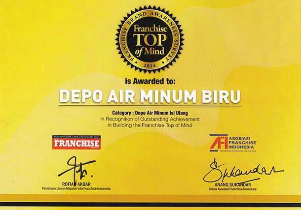 Menawarkan kemudahan dalam memperoleh air minum yang sehat, berkualitas terbaik dengan harga yang terjangkau Biru semakin mudah disebutkan oleh masyarakat sebagai salah satu solusi terbaik dalam memenuhi kebutuhan air minum. Hal inilah yang membuat Biru bisa keluar sebagai Top of Mind dalam survey AFI dan Majalah Info Franchise.