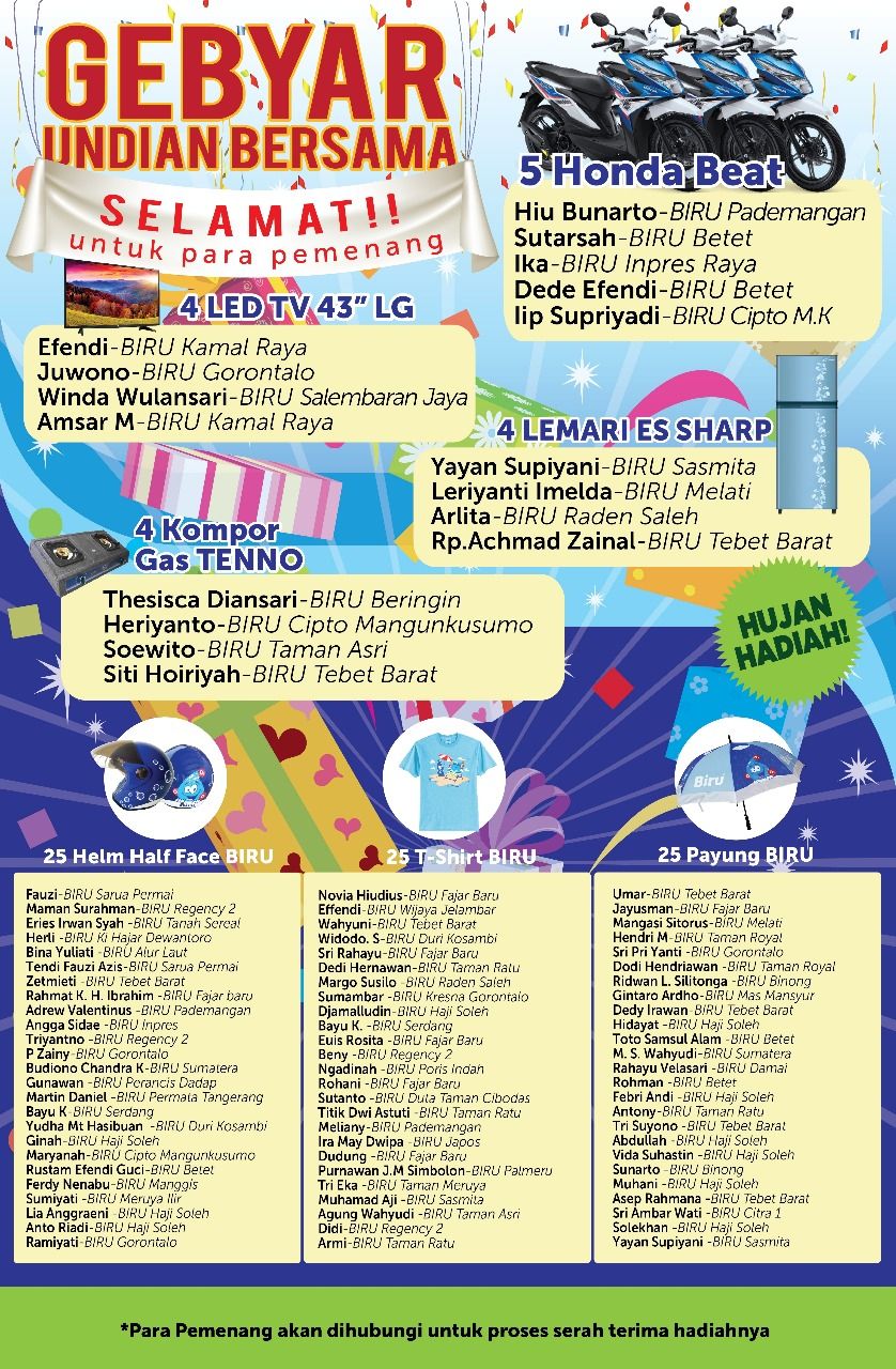 Berikut daftar pemenang Gebyar Undian Bersama Air Minum Biru Jakarta & Tangerang :