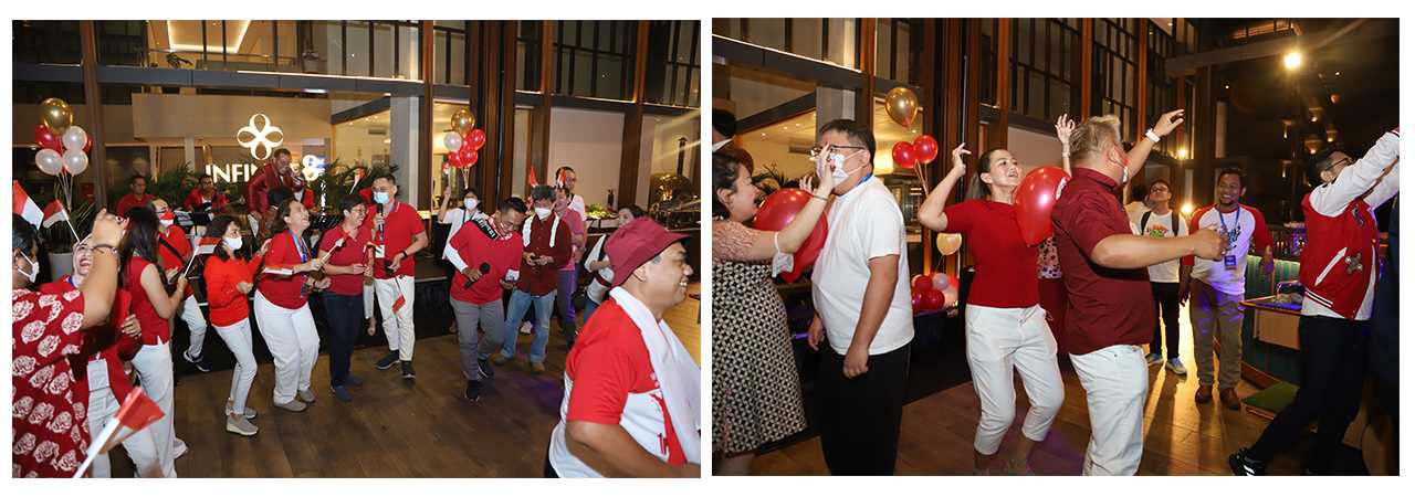 Pesta Pesona Merah Putih dalam menyambut hari Kemerdekaan RI yang ke-77 diselenggarakan secara meriah dan penuh kegembiraan bebareng dengan makan malam di hari kedua. Lelang lagu kemerdekaan, peragaan busana merah putih, dansa balon berpasangan, kuis, kontes foto booth, dan undian doorprize menjadikan suasana malam pesta berlangsung penuh tawa. (AR)