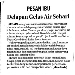 70% bagian tubuh manusia terdiri dari air, tubuh membutuhkan cairan yang cukup setiap harinya. Selain mengonsumsi makanan sehat, masyarakat Indonesia diminta minum delapan gelas air dalam sehari agar tubuh tetap seha...