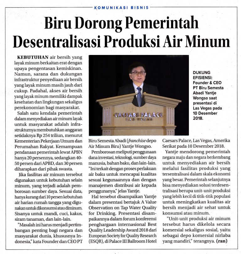Fasilitas air bersih siap minum sebabkan pemborosan sumber daya karena hanya kurang dari 10% air rumah tangga digunakan untuk minum. Biru dorong pemerintah desentralisasi produksi air minum. Harian Jawa Pos (Kamis, 1...