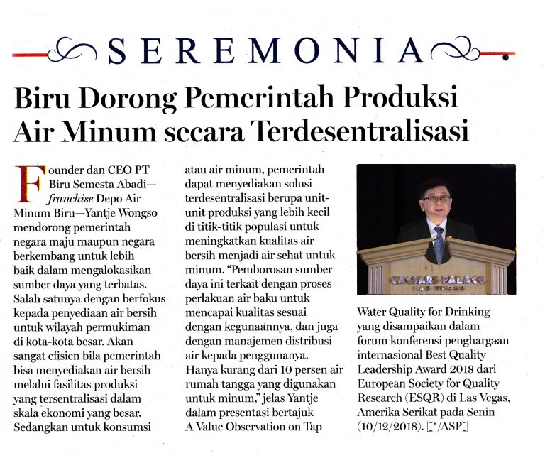 PT. Biru Semesta Abadi meraih penghargaan internasional “Best Quality Leadership Award 2018”. Penghargaan yang diberikan oleh European Society for Quality Research (ESQR) ini diterima langsung oleh Yantje...