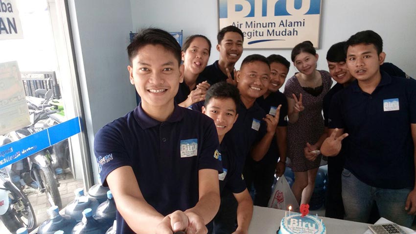Gerai Air Minum Biru Kejayaan Depok merayakan hari jadinya yang ke-6, Rabu (22/03/2017). Karyawan Gerai Biru Kejayaan merayakan hari spesial tersebut dengan memesan kue ulang tahun spesial.